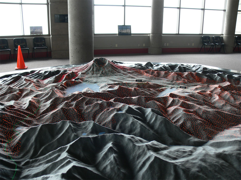 The inside of the exhibit had a large topographical map with tiny lights that demonstrated in a visual format this series of events that took place back in 1980. After the landslide and the stone wind, a torrent of volcanic rock poured out of the crater and covered the landslide material with up to 100 feet of pumice rock. He had a sample there with them, and it was extremely light. The entire blast area in front of the volcano was covered by the landslide debris, and the pumice layer on top. The average height was 200 feet, with some spots being six hundred feet deep.