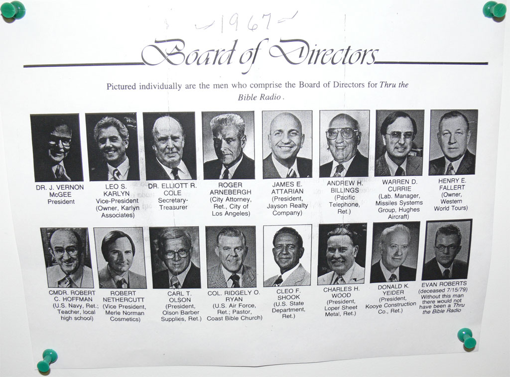 A bulletin board with the pictures of Dr. McGee’s wife and daughter hung on the wall on the left side of the room. At the top right of this, within view of his desk, were pictures of the four men who had the most influence on Dr. Magee's life. Michael pressed play on a cassette recorder, and we listened to Dr. McGee refer to these four men in one of his messages.