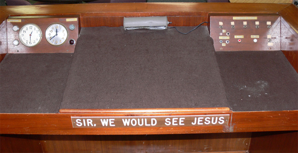 The most striking feature of the pulpit were the words written on the back of the pulpit which would be seen by a visiting minister. In large letters, it said, “Sir, we would see Jesus.” To the left side on the back of the pulpit are the on/off lights for radio and TV. Apparently Dr. McGee experimented with TV for a couple of months, but found the time restrictions unbearable. On the right-hand side were various toggle switches for overhead lighting for his many visual aids that he used while preaching. The other thing I noticed was how wide the pulpit was. He had plenty of room to lay out three or four different books besides the Bible.