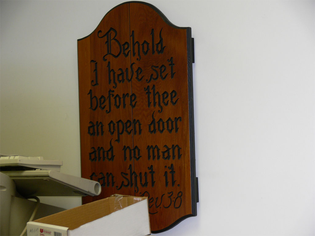 In the corner of the lunchroom was Dr. McGee’s original pulpit which he preached from at Church of the Open Door. The actual building was demolished around 1978 when the congregation voted to move because the building had become landlocked in the downtown area and the entire congregation had to drive in each Sunday. In fact, shortly after the sale, as a result of an earthquake, the building was condemned, and has since been torn down. An office tower now sits in its spot. The pulpit was donated to Dr. McGee just before they tore down the building.